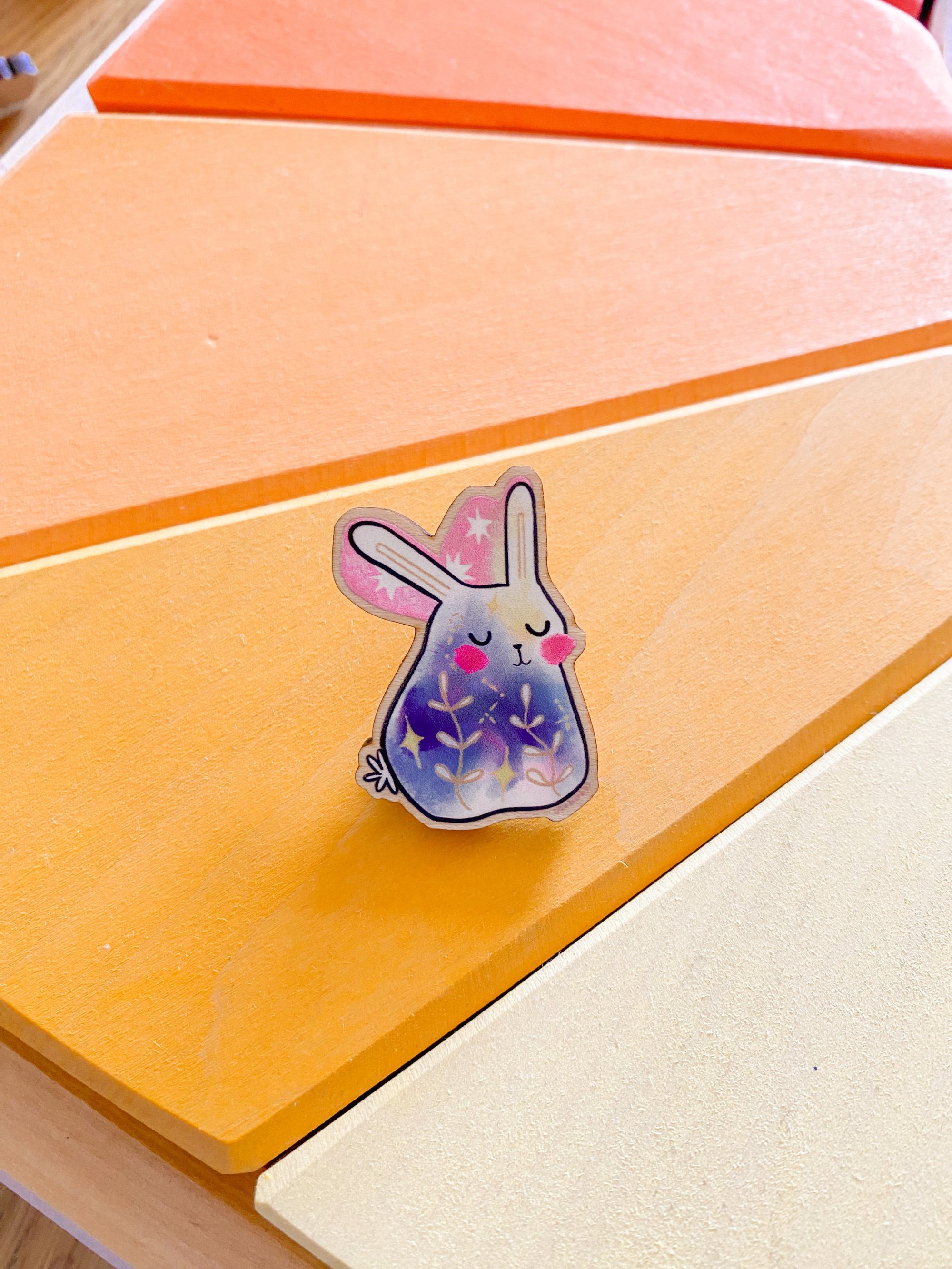 A dreamy little celestial bunny to carry some zen with you. This piece is hand illustrated and made from 4mm thick sustainably sourced Maple veneered MDF.