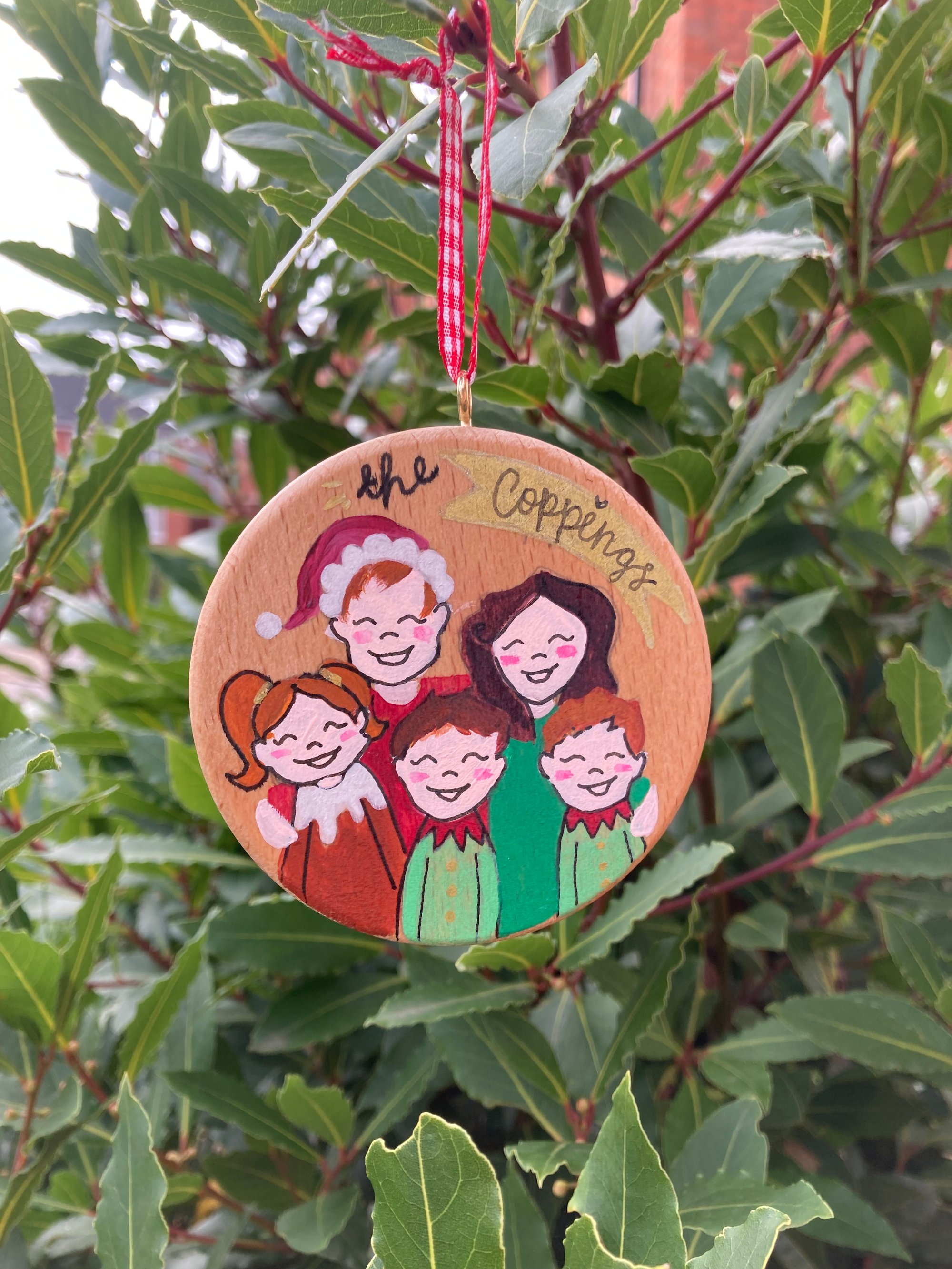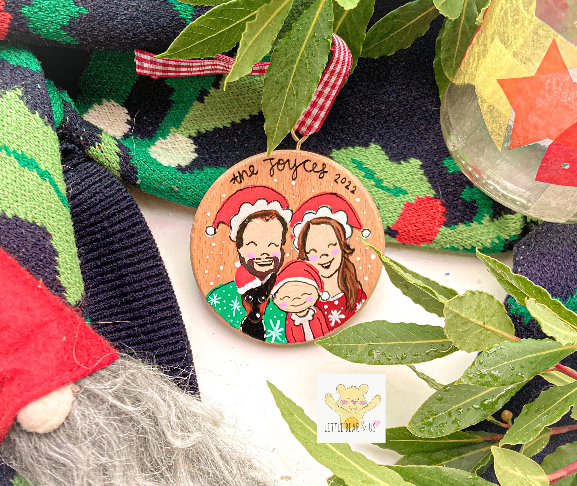 Hand painted Christmas decorations on a 7.5cm beech wood disc with hanging loop and ribbon.
